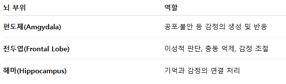 감정은 뇌의 특정 부위에서 생성·조절됩니다. 특히 아래의 뇌 영역이 핵심 역할을 합니다.
