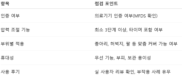 - 장점: 4~7단계 압력 조절, 타이머 설정 가능. 간편한 착용 방식과 휴대성으로 사용자 만족도 높음.